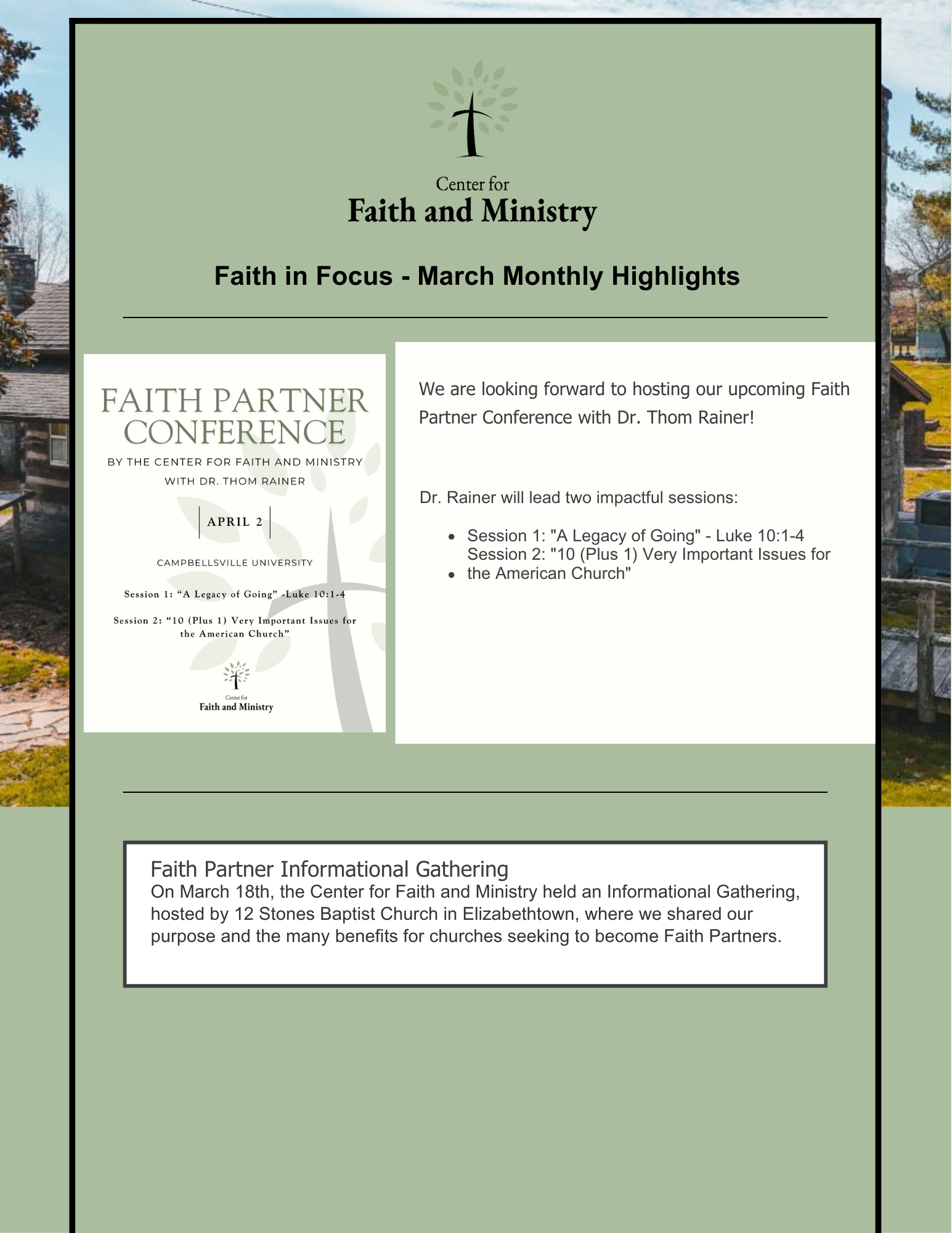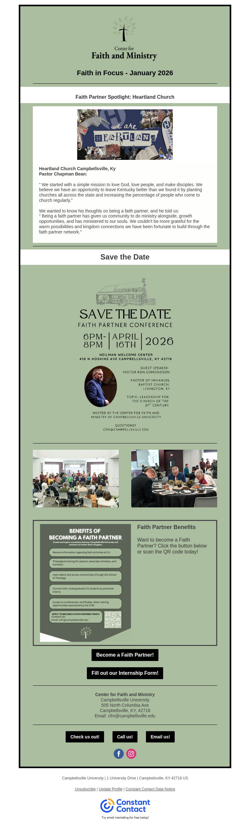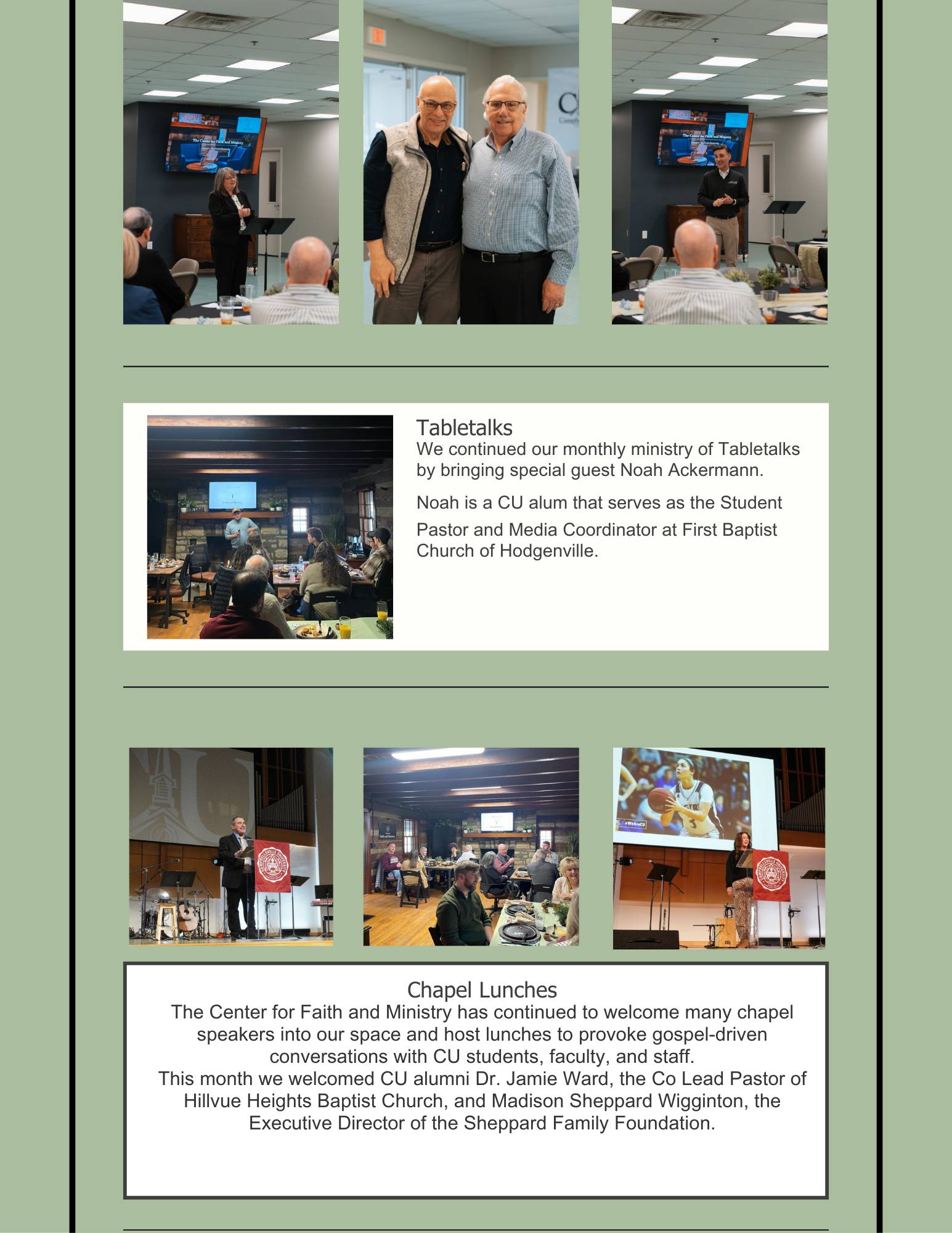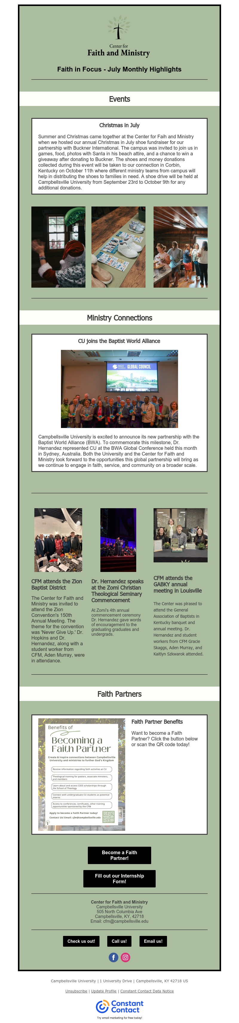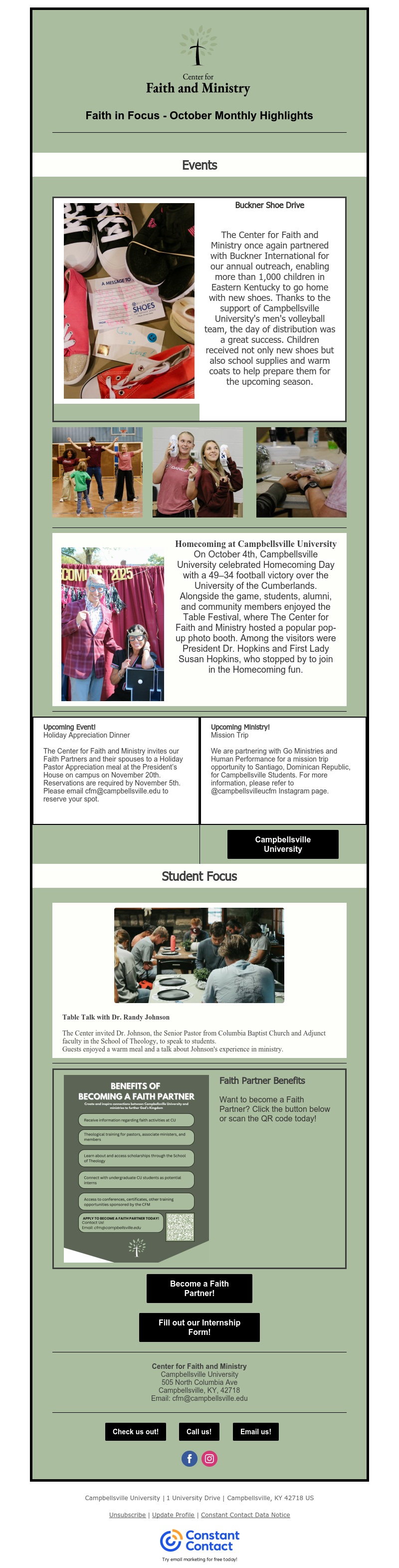 Faith in Focus is the Center for Faith and Ministry's monthly newsletter, offering an insightful glimpse into the vibrant faith life at Campbellsville University. Each edition highlights key happenings at the Center, from events and initiatives to personal stories of faith, alongside faith-related news and updates from across the University community. Stay connected and inspired as we share the ways faith is shaping lives at Campbellsville University.