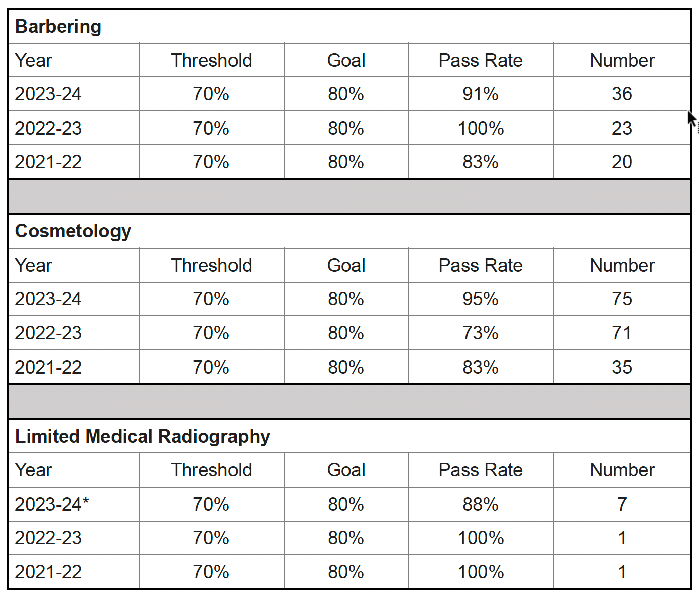 Certificate in Barbering, Cosmetology, and Limited Medical Radiography uses “Certification Pass Rate” as a measure of student achievement. A threshold of 70% average has been set for the programs. The faculty has observed from professional experience that if a class scores 70% or less, students do not have the ability or skills necessary to function in the profession. Given the diverse background of students in the program, a goal of 80% pass rate has been selected. This pass rate is calculated, allowing 3 attempts within one year of program completion.
