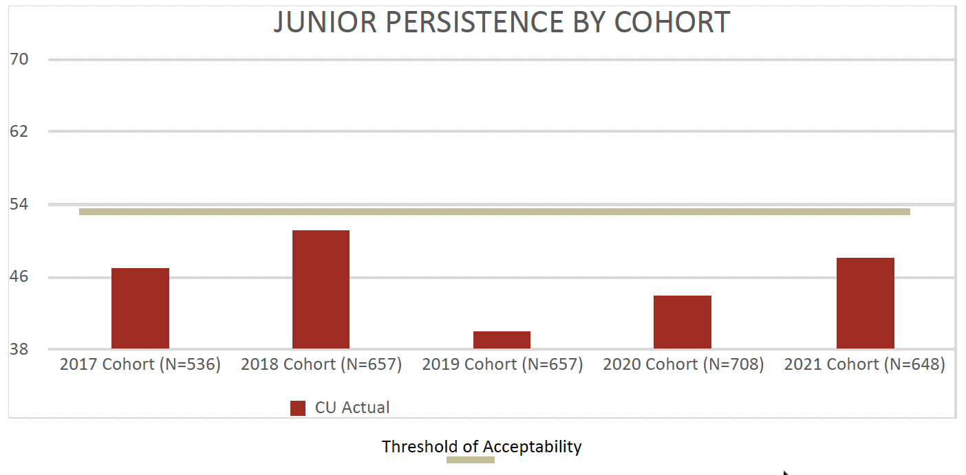 The threshold of acceptability is 90% of the five-year average (=55%). The Achievement Goal of 67% is the average of the CU comparison group (Belhaven, Bethel, Charleston Southern, Coker, Cumberland, Florida Memorial, Lindsey Wilson, Lubbock Christian, Mars Hill, Pfeiffer, Thomas More, U of Mobile, U of Mount Olive, and U of the Cumberlands).