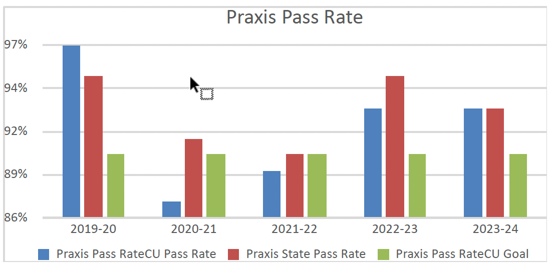 The School of Education (SOE) uses PRAXIS Subject Assessment pass rates and job placement data to evaluate student achievement and program effectiveness. In alignment with CAEP standards and the Kentucky Teacher Performance Standards (KTPS/InTASC), the SOE regularly analyzes this data to guide strategic planning and continuous improvement. The university considers PRAXIS success a key indicator of both academic and professional readiness. The SOE aims for a 90% pass rate, reflecting its commitment to rigorous preparation and the CU mission of fostering professional excellence in a supportive environment.