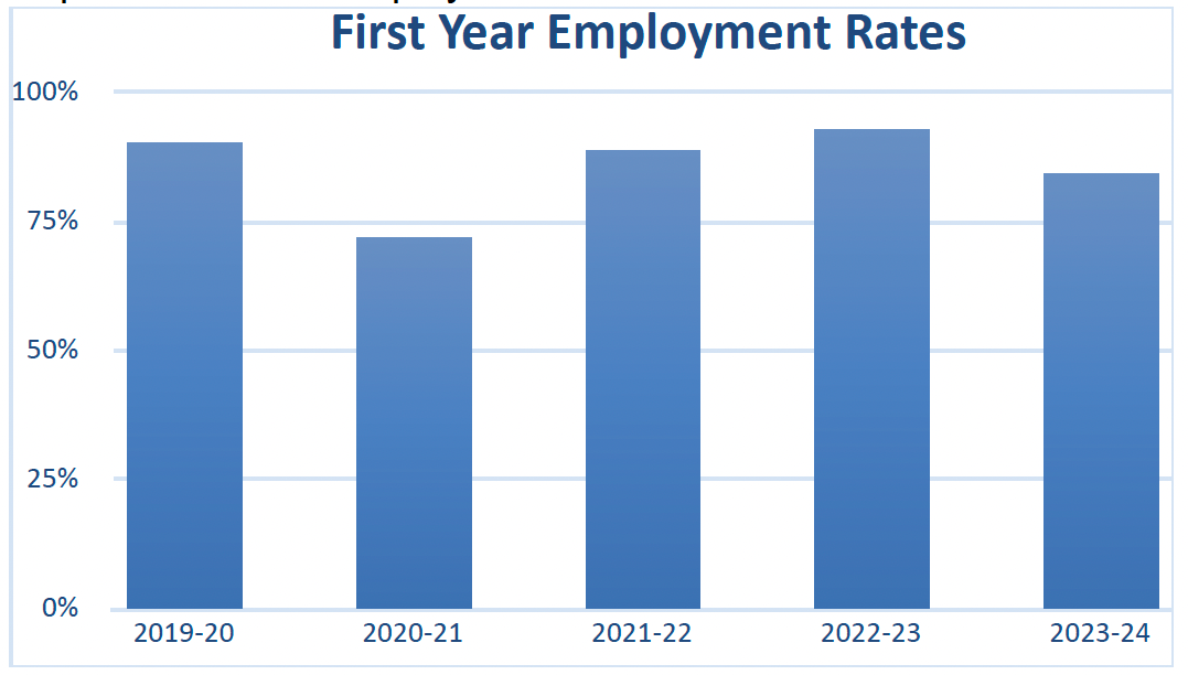*Graph 2 shows employment rates for initial program completers. Campbellsville University’s School of Education sets a 50% employment threshold and a 70% goal, matching the Kentucky average. While some graduates pursue advanced degrees or other paths, 84% of 2023-24 graduates secured jobs in their certified fields, reflecting strong workforce readiness.