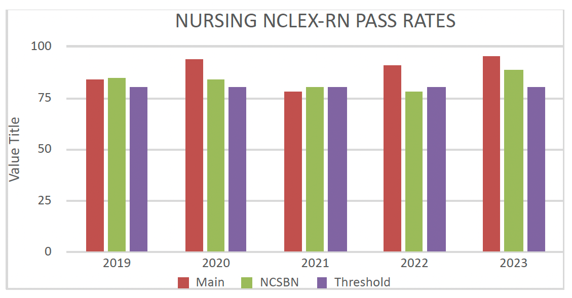 The School of Nursing measures student success through first-attempt NCLEX-RN pass rates. The graph shows Campbellsville University’s associate degree pass rates over five years compared to the national average. Both ACEN and the Kentucky State Board of Nursing set an 80% pass rate benchmark, which CU’s School of Nursing meets consistently.