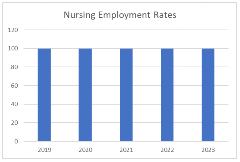 All new graduates of the Associate Degree in Nursing program on main campus at Campbellsville University had a nursing job within six months of graduation. In 2023, 16 students graduated and of that 0 responded to the survey related to working in their field. However, the SON was able to verify 100% job placement using alternative methods(social media, phone calls, and visual confirmation).