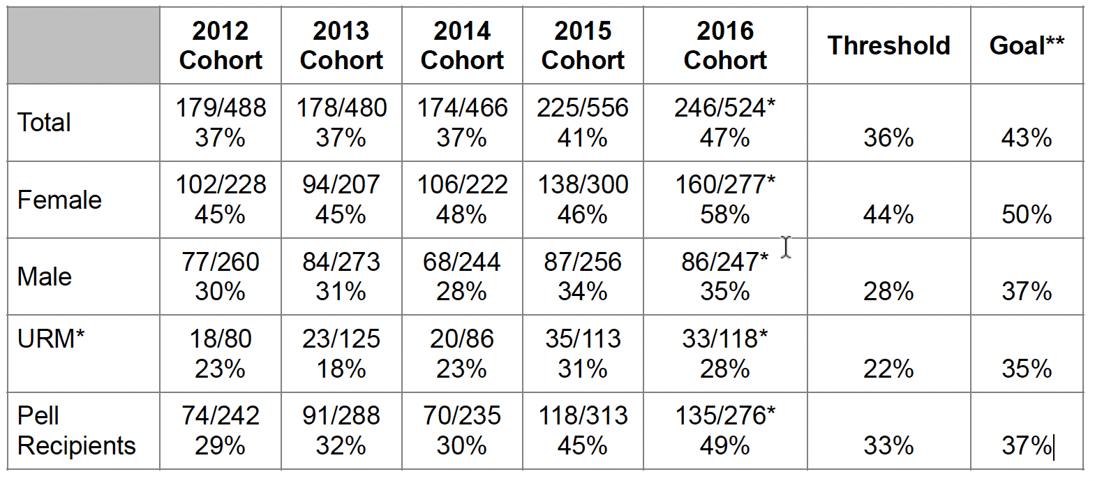 *Underrepresented Minorities (URM) includes: domestic students in the following race/ethnicities: Black or African American, Hispanics/Latino, Two or more races, Asian, American Indian or Alaska Native, and Native Hawaiian or Other Pacific Islander. *Calculated from IPEDS using actual number of graduates and the percentage