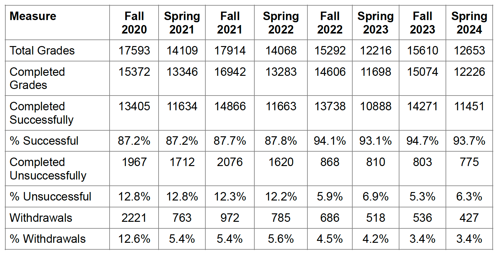 Course completion is a key indicator of student success at Campbellsville University, supporting the core value of fostering a student-centered environment. The university sets an 85% completion rate as the threshold and aims for a 92% success rate. Grades of F, I, NR, U, and WA are counted as unsuccessful, while NG, W, and WN are excluded from calculations. For example, NG grades are often assigned to components like science labs that are part of a larger course.