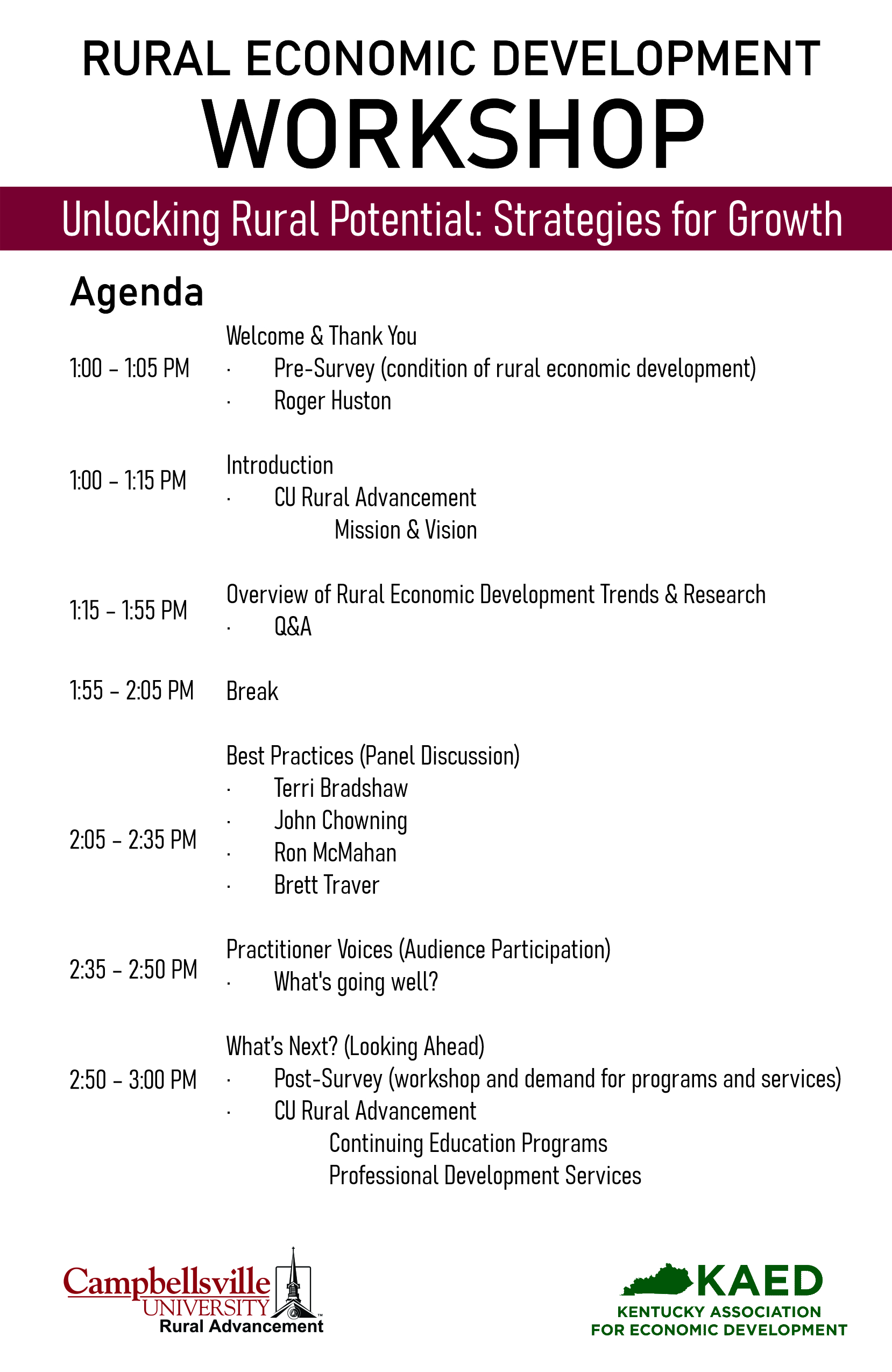 Campbellsville University’s Rural Economic Development Workshop unites community leaders, business owners, educators, and decision-makers to explore forward-thinking solutions for rural progress. Through engaging speakers, interactive sessions, and hands-on training, the workshop provides participants with actionable strategies to foster economic growth, attract new opportunities, and strengthen the long-term resilience of rural communities.